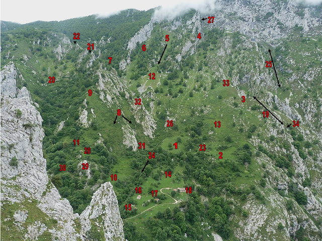 Imagen de la peña bajo el imponente macizo conformado por la Cabeza, Agudu y Ariscu Sonllanu. Marcado con una línea de puntos rojos se localiza la ubicación del Traviesu La Llambria y el senderu que lo recorre. 1. Toyu Santa 2. Redonda La Miseria 3. Jorcáu Carancova 4. La Escampada 5. Cueva Covanceli 6. Paré Covanceli 7. La cabeza Sonllanu 8. Los Senderos (de Cuesta Lluenga) 9. Colláu La Cuesta 10. Cuesta Lluenga 11. El Jorcáu Sigüenda 12. La Pasada La Cuesta 13. La Cueva Intienzu y La Toya Intienzu14. El Recuencu La Escampada 15. La Cueva Pria (casa dentro) 16. Los Pozos 17. El Canalón (por donde sube el camino original a enlazar con el de arriba desde La Puente Pria) 18. Cojigares 19. La Toya Intienzu 20. La Canal de Llamedu 21. La Llambria La Escampada 22. Colláu Los Avaros 23. El Paré Los Avaros 24. El Agudu Sonllanu 25. El Ariscu Sonllanu 26. La Cabeza del Matadoriu 27. El Jorcáu Canaldellegu 28. El Ariscu Canaldellegu 29. Jorcáu Tarañones 30. Jorcáu La Llambria Y Traviesu La Llambria 31. La Torre Sigüenda 32. El Camaretu / El Camaretu Sigüenda (con una toya arrimada). 33. La Güerta del Carriazu (allí se metían los castrones, se entraba desde arriba) 34. Sobresigüenda 35. El Amiyadoriu 36. El Jorcadín de Intienzu 37. El Casar y Prados de Intienzu |