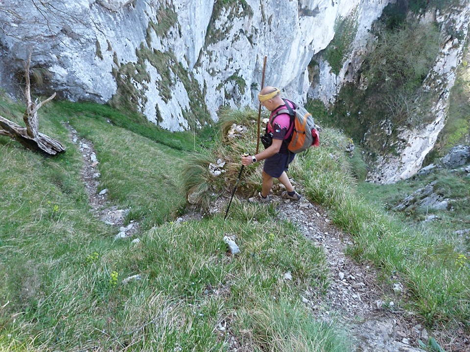 El senderu va en travesía faldeando por las pandas herbosas bajo las peñas calizas |